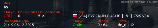 Играет на Counter Strike Source сервере. Страна: РоссияПервый раз замечен 21:17 06.12.2025