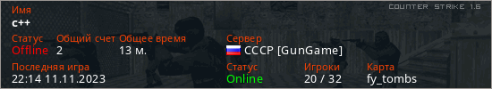 Играет на Counter Strike 1.6 сервере. Страна: РоссияПервый раз замечен 14:04 11.11.2023