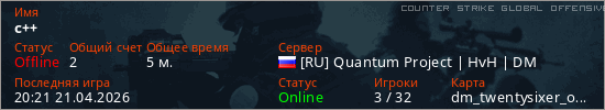 Играет на Counter Strike Global Offensive сервере. Страна: РоссияПервый раз замечен 20:09 21.04.2026