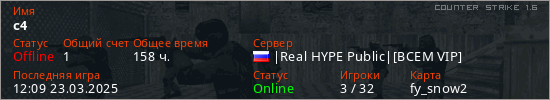 Играет на Counter Strike 1.6 сервере. Страна: РоссияПервый раз замечен 18:15 12.02.2025