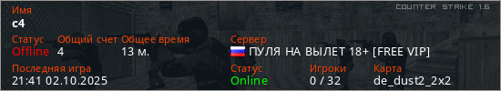 Играет на Counter Strike 1.6 сервере. Страна: РоссияПервый раз замечен 10:25 06.09.2025