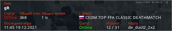Играет на Counter Strike 1.6 сервере. Страна: РоссияПервый раз замечен 16:18 12.10.2021