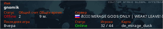 Играет на Counter Strike Global Offensive сервере. Страна: РоссияПервый раз замечен 11:41 29.07.2025