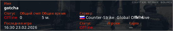 Играет на Counter Strike Source сервере. Страна: РоссияПервый раз замечен 16:28 23.02.2026