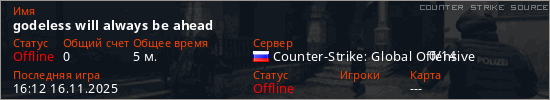 Играет на Counter Strike Source сервере. Страна: РоссияПервый раз замечен 15:54 16.11.2025