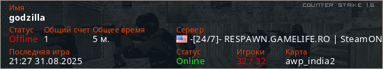 Играет на Counter Strike 1.6 сервере. Страна: СШАПервый раз замечен 21:19 31.08.2025