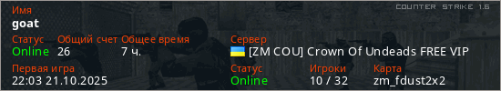 Играет на Counter Strike 1.6 сервере. Страна: УкраинаПервый раз замечен 22:03 21.10.2025
