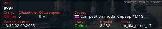 Играет на Counter Strike Source сервере. Страна: РоссияПервый раз замечен 17:10 01.09.2025