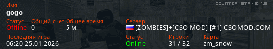 Играет на Counter Strike 1.6 сервере. Страна: РоссияПервый раз замечен 06:18 25.01.2026
