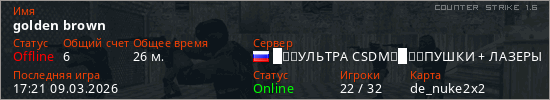 Играет на Counter Strike 1.6 сервере. Страна: РоссияПервый раз замечен 11:14 06.03.2026