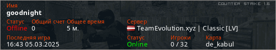 Играет на Counter Strike 1.6 сервере. Страна: ЛатвияПервый раз замечен 16:41 05.03.2025