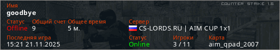 Играет на Counter Strike 1.6 сервере. Страна: РоссияПервый раз замечен 15:14 21.11.2025
