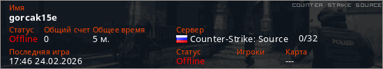 Играет на Counter Strike Source сервере. Страна: РоссияПервый раз замечен 17:28 24.02.2026