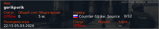 Играет на Counter Strike Source сервере. Страна: РоссияПервый раз замечен 22:11 05.03.2026