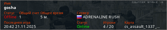 Играет на Counter Strike 1.6 сервере. Страна: РоссияПервый раз замечен 20:34 21.11.2025