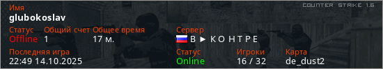 Играет на Counter Strike 1.6 сервере. Страна: РоссияПервый раз замечен 13:29 08.10.2025
