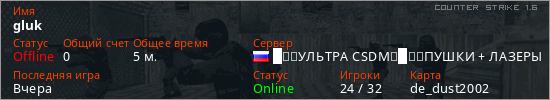 Играет на Counter Strike 1.6 сервере. Страна: РоссияПервый раз замечен 20:08 27.02.2026