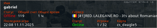 Играет на Counter Strike 1.6 сервере. Страна: РумынияПервый раз замечен 15:07 10.05.2022