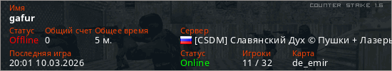 Играет на Counter Strike 1.6 сервере. Страна: РоссияПервый раз замечен 19:59 10.03.2026