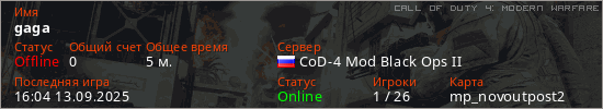 Играет на Call of Duty 4: Modern Warfare сервере. Страна: РоссияПервый раз замечен 15:52 13.09.2025