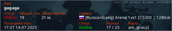 Играет на Counter Strike Global Offensive сервере. Страна: РоссияПервый раз замечен 17:37 12.07.2025