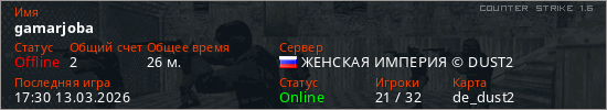 Играет на Counter Strike 1.6 сервере. Страна: РоссияПервый раз замечен 17:30 05.02.2026