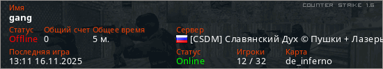 Играет на Counter Strike 1.6 сервере. Страна: РоссияПервый раз замечен 13:01 16.11.2025
