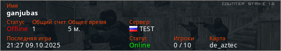 Играет на Counter Strike 1.6 сервере. Страна: РоссияПервый раз замечен 21:20 09.10.2025
