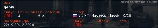 Играет на Counter Strike Source сервере. Страна: РоссияПервый раз замечен 21:46 29.12.2024