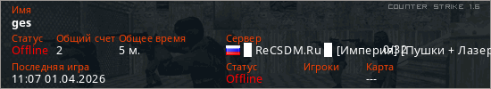 Играет на Counter Strike 1.6 сервере. Страна: РоссияПервый раз замечен 11:02 01.04.2026