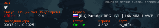 Играет на Counter Strike Global Offensive сервере. Страна: РоссияПервый раз замечен 16:54 17.10.2025