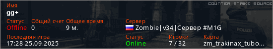 Играет на Counter Strike Source сервере. Страна: РоссияПервый раз замечен 17:03 25.09.2025