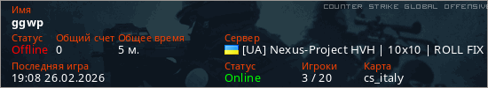 Играет на Counter Strike Global Offensive сервере. Страна: УкраинаПервый раз замечен 19:06 26.02.2026