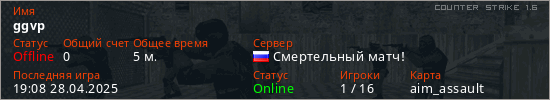 Играет на Counter Strike 1.6 сервере. Страна: РоссияПервый раз замечен 19:06 28.04.2025