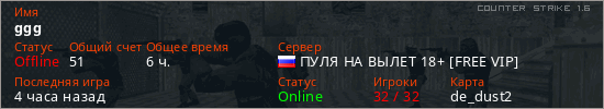 Последний раз был в сети 2 часа назад Игрок с таким ником замечен на 48 серверах