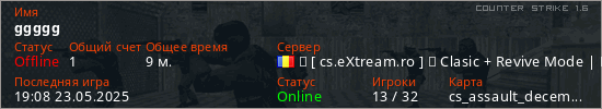 Играет на Counter Strike 1.6 сервере. Страна: РумынияПервый раз замечен 06:54 19.04.2025