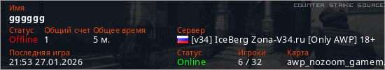 Играет на Counter Strike Source сервере. Страна: РоссияПервый раз замечен 21:47 27.01.2026