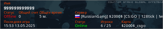 Играет на Counter Strike Global Offensive сервере. Страна: РоссияПервый раз замечен 15:44 13.05.2025