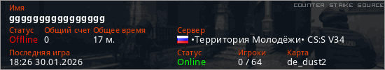 Играет на Counter Strike Source сервере. Страна: РоссияПервый раз замечен 15:51 08.01.2026