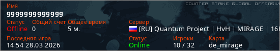 Играет на Counter Strike Global Offensive сервере. Страна: РоссияПервый раз замечен 14:48 28.03.2026