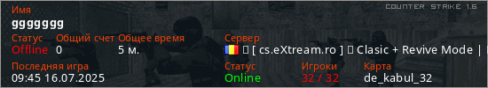 Играет на Counter Strike 1.6 сервере. Страна: РумынияПервый раз замечен 09:16 16.07.2025
