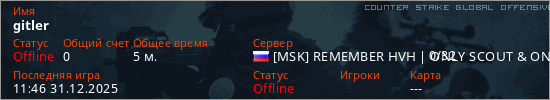 Играет на Counter Strike Global Offensive сервере. Страна: РоссияПервый раз замечен 11:44 31.12.2025