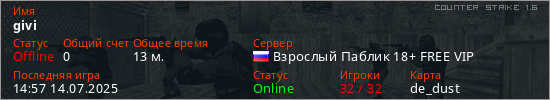Играет на Counter Strike 1.6 сервере. Страна: РоссияПервый раз замечен 14:38 13.07.2025