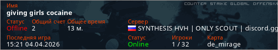 Играет на Counter Strike Global Offensive сервере. Страна: РоссияПервый раз замечен 09:38 20.03.2026
