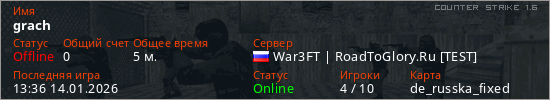 Играет на Counter Strike 1.6 сервере. Страна: РоссияПервый раз замечен 13:34 14.01.2026