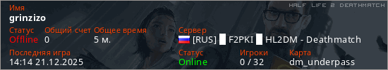 Играет на Half Life 2 DeathMatch сервере. Страна: РоссияПервый раз замечен 14:12 21.12.2025
