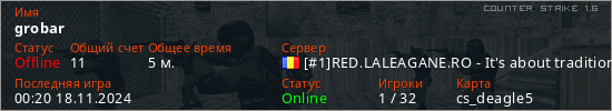 Играет на Counter Strike 1.6 сервере. Страна: РумынияПервый раз замечен 00:09 18.11.2024
