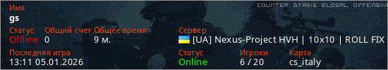 Играет на Counter Strike Global Offensive сервере. Страна: УкраинаПервый раз замечен 12:32 05.01.2026
