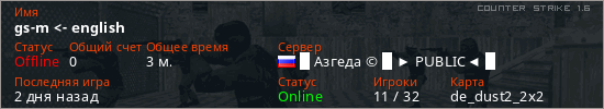 Играет на Counter Strike 1.6 сервере. Страна: РоссияПервый раз замечен 05:54 16.04.2026