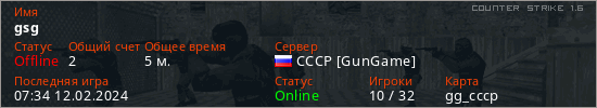 Играет на Counter Strike 1.6 сервере. Страна: РоссияПервый раз замечен 07:30 12.02.2024